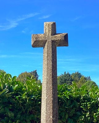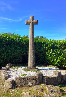 Cette haute croix latine contemporaine en granit, aux arêtes chanfreinées, ne présente ni figuration ni millésime. Elle est érigée sur un amas rocheux, au départ de l’ancien chemin qui passe par le moulin, puis devant la croix de l’ancien pont de Gouby pour rejoindre le hameau.
