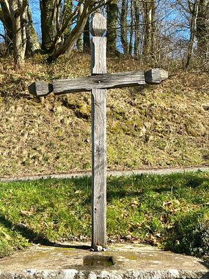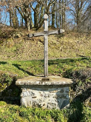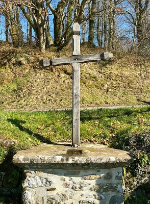Cette croix pommelée en bois, aujourd’hui en mauvais état de conservation (2026), est implantée dans une table en granit chanfreinée à sa base (ancienne table d’autel). L’ensemble repose sur un piédestal en maçonnerie traditionnelle. Dépourvue de toute figuration et ne portant aucun millésime, elle se caractérise par sa grande simplicité, qui suggère un élément de dévotion locale sans datation précise.
