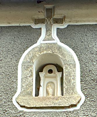 Cette croix est sculptée en léger relief. Elle présente des bras courts et élargis à leurs extrémités. Au centre, on distingue un monogramme marial formé d’un M entrelacé, ce qui renforce l’idée d’une protection placée sous le patronage de la Vierge. La croix est intégrée à la maçonnerie, comme partie constitutive de la composition. un petit édicule sculpté miniature, doté d’une petite ouverture circulaire à son sommet. Dans la niche intérieure se trouve une petite statue, en bas-relief, représentant une Vierge à l’Enfant. Ce type d’aménagement correspond à une niche de dévotion domestique, fréquente dans les campagnes. Elle remplissait plusieurs fonctions : protection spirituelle de la maison et de ses habitants, affirmation publique de la foi catholique, et marque apotropaïque destinée à éloigner le mal, les maladies et les intempéries.