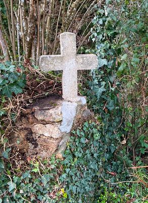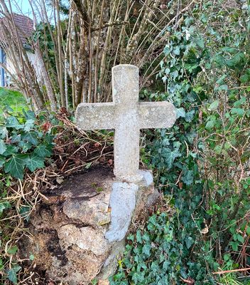 Cette petite croix en béton se caractérise par des extrémités aux formes arrondies. Elle est simplement posée au sommet d’un mur de clôture en pierres sèches. Dépourvue de toute figuration sculptée ou gravée, elle ne présente également aucun millésime ni inscription permettant d’en préciser la date d’érection. Par sa sobriété et l’emploi de matériaux modestes, elle s’inscrit dans la tradition des croix rurales à vocation essentiellement dévotionnelle ou de marquage symbolique de l’espace.
