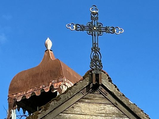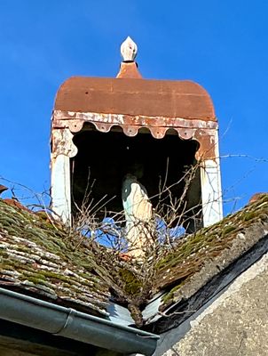 Cette croix sommitale en fonte ajourée est typique des chapelles rurales et des édifices de dévotion locale. Ses bras horizontaux et verticaux se terminent par des extrémités trilobées, motif décoratif évoquant symboliquement la Trinité. Le noyau central ajouré, est composé de volutes et d’entrelacs moulés. Le fût inférieur, également ornementé, intègre un motif ajouré vertical assurant la transition entre la croix proprement dite et son système de fixation. La perception inhabituelle de la croix, observée ici par l’arrière, est liée à l’orientation du bâtiment par rapport au point d’observation. La croix est installée dans le sens liturgique correct, seule sa face non décorée principale étant visible depuis ce point de vue. Son implantation sur le pignon, et non sur un clocher, confirme le caractère modeste de l’édifice. Le petit dôme abritant la statue de la Vierge est surmonté d’un ornement sommital de forme élancée. Ce motif, évoquant une flamme stylisée ou un bouton floral fermé. Sur le plan symbolique, cette forme peut être interprétée comme une représentation de la flamme spirituelle. Elle peut également être rapprochée du registre marial du lys, symbole traditionnel de pureté et de l’Immaculée Conception, fréquemment associé à la Vierge dans l’iconographie chrétienne. Ce type d’ornement est caractéristique des édicules religieux et des petites chapelles rurales édifiées ou remaniées à la fin du XIXe siècle et au début du XXe siècle, période marquée par un renouveau des pratiques dévotionnelles et par l’essor des chapelles de pèlerinage et de dévotion locale. La présence de la Vierge sous le petit clocheton constitue l’élément symbolique le plus significatif. La statue est placée dans une niche ouverte, surmontée d’un clocheton-campanile de faible dimension. Il s’agit clairement d’un édifice dédié à la Vierge, ce qui confirme pleinement son appellation. La figure mariale apparaît ici comme protectrice du lieu, visible depuis l’extérieur, associée à une fonction votive et probablement funéraire. Le petit clocheton à toiture conique, parfois qualifiée de bulbe simple, correspond à une typologie fréquemment rencontrée aux XVIIe et XVIIIe siècles. Il accueillait très vraisemblablement une cloche de chapelle, utilisée lors des prières, des enterrements ou à l’occasion d’usages ponctuels tels que les processions et les dévotions locales. L’architecture générale repose sur une maçonnerie traditionnelle en pierre locale enduite, associée à une couverture en tuiles plates. L’édifice ne relève pas d’une construction néogothique « neuve » du XIXe siècle, mais correspond plutôt à un bâtiment plus ancien ayant fait l’objet d’adaptations et de reprises successives. La datation la plus probable peut ainsi être proposée : construction initiale au XVIIe siècle (voire à la fin du XVIe siècle), avec des remaniements aux XVIIIe et XIXe siècles. Cette hypothèse repose sur plusieurs arguments concordants : typologie mariale rurale, présence d’un clocheton modeste, installation d’une croix sommitale en fonte industrielle et existence attestée de sépultures. L’association chapelle et inhumations présente en effet une forte cohérence historique. La chapelle a servie de lieu de sépulture privilégié pour certaines familles ou à un usage antérieur à la normalisation stricte des cimetières paroissiaux. Ce schéma est caractéristique de nombreuses petites chapelles funéraires ou semi-funéraires du Limousin.