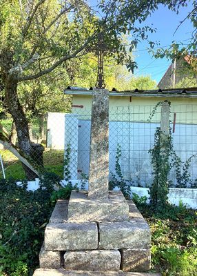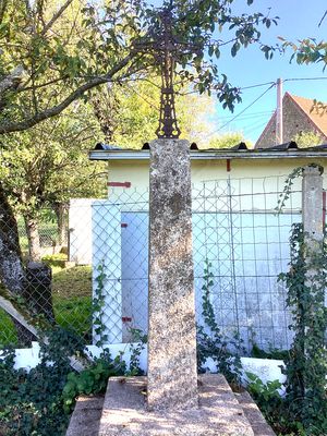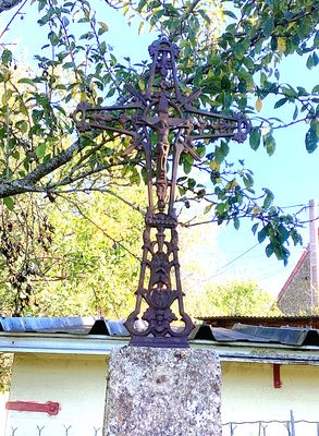 Cette croix fleurdelisée en fonte présente au centre du croisillon un crucifix portant le Christ en croix, la tête ceinte d’une couronne d’épines. Sur le croisillon supérieur, un cartouche (timbre) arbore le monogramme INRI, entouré de quatre rayons lumineux. Le reste de la croix est orné de motifs végétaux, feuilles de vigne et épis de typhas, symboles respectifs de l’Eucharistie et de l’abondance. L’ensemble est érigé sur un fût pyramidal en granit, lui-même inséré dans un socle carré. Le piédestal, en maçonnerie traditionnelle, comporte à sa base un reposoir destiné aux dévotions locales. Le typhas, aussi appelé « massette » ou « quenouille des marais », est une plante aquatique des zones humides. Sa présence dans la décoration des croix en fonte du XIXᵉ siècle n’est pas anodine. le typhas renvoie davantage au registre de la fertilité, de la vie naturelle et de l’abondance des moissons.