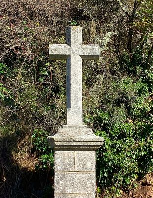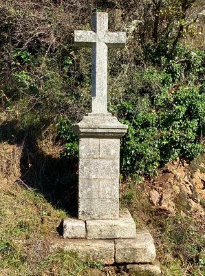 Cette croix latine chanfreinée est de facture contemporaine. Elle est implantée dans une table moulurée composée de feuillures et d’une gorge, qui lui sert de base immédiate. L’ensemble repose sur un piédestal monolithe en pierre de taille, lui-même établi sur un emmarchement de trois degrés. Cette composition soignée, typique des aménagements religieux modernes inspirés des modèles anciens, et confère à la croix une présence traditionnels des croix de chemin ou de cimetière.