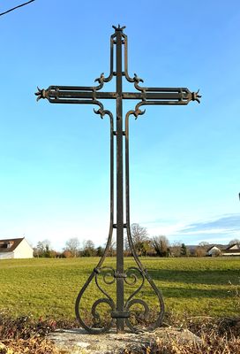 Cette croix est de forme latine, entièrement réalisée en fer forgé. Elle est constituée de deux montants parallèles formant le fût et les bras, reliés par des entretoises horizontales. Les extrémités des bras et du sommet sont ornées de fleurons stylisés, aux formes recourbées évoquant des bourgeons ou des flammes, motif fréquent dans la serrurerie religieuse du XIXᵉ siècle. À la croisée, des volutes symétriques adoucissent la transition entre le fût et les bras. La partie inférieure du fût se termine par un élargissement ornemental, composé de volutes affrontées, servant à la fois d’élément décoratif et de renfort structurel avant l’ancrage dans la pierre. Elle repose sur une table en pierre de taille, aux arêtes chanfreinées. Le piédestal en pierre appareillée présente une face centrale portant la date gravée « 1900 », indiquant très probablement l’année d’érection ou de réinstallation du monument.