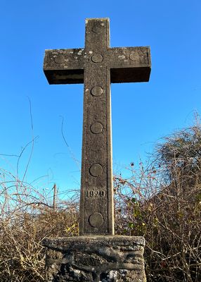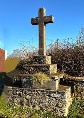 Cette haute et large croix de mission, réalisée en béton, est datée de 1920. Elle présente une silhouette monumentale et élancée, caractéristique des croix de mission érigées au début du XXe siècle. L’avers est orné de motifs circulaires en léger relief, disposés de manière régulière, qui animent la surface tout en conservant une grande sobriété décorative. La croix repose sur un socle de plan carré, également en béton, assurant la stabilité de l’ensemble. Celui-ci est lui-même implanté sur un emmarchement composé de trois degrés, qui élève le monument et renforce sa visibilité.