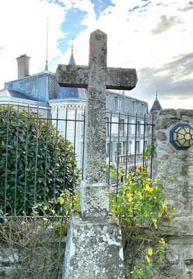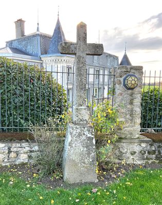 Cette croix latine en granit présente des extrémités en pointe de diamant. Le fût, légèrement pyramidal, repose sur un petit dé de plan carré, et l’ensemble est inséré dans un socle de forme pyramidale tronquée. La croix ne porte aucun millésime. Elle est située à proximité du château de Fontvieille, demeure de la seconde moitié du XIXᵉ siècle, résultant d’ajouts successifs réalisés entre environ 1870 et 1895. Le château fut aménagé par Hippolyte Sigaud, alors propriétaire d’un important domaine agricole. Le cadastre de 1824 mentionne qu’un ancien logis de ferme occupait auparavant cet emplacement, dont une partie de la structure centrale semble avoir été conservée lors de la construction de l’édifice actuel.