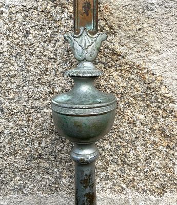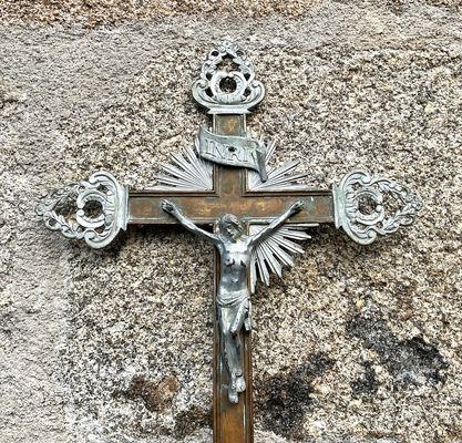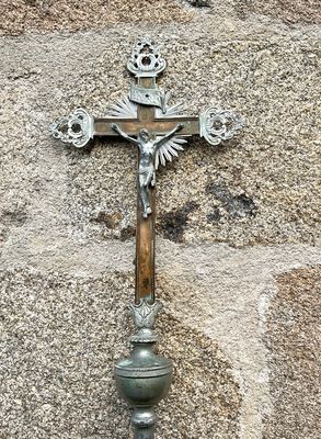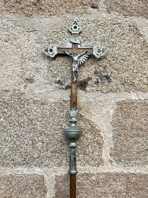 Cette croix de procession est réalisée en métal. Elle se compose d’une croix latine fixée sur une hampe en métal. La croix proprement dite présente des bras droits, ornés à leurs extrémités de motifs ajourés et symétriques, formant des rinceaux et des volutes décoratives, dans un style d’inspiration XIXᵉ siècle. Au centre du croisillon se trouve un Christ crucifié, exécuté en ronde-bosse. Le Christ est représenté les bras étendus, la tête légèrement inclinée, vêtu d’un périzonium sobre. Derrière le corps, des rayons disposés en éventail soulignent la figure et accentuent la dimension symbolique de la représentation. Au sommet de la croix prend place un cartouche portant l’inscription « INRI », surmonté d’un élément décoratif ajouré de forme couronnée. La partie inférieure de la croix est reliée à une douille décorative ornée de motifs végétaux stylisés. Celle-ci est prolongée par un nœud de procession particulièrement soigné : de forme ovoïde, il est ceinturé d’une frise décorative répétitive et repose sur un col évasé. Ce nœud, à la fois fonctionnel et symbolique, constitue un élément essentiel de la préhension lors des processions.