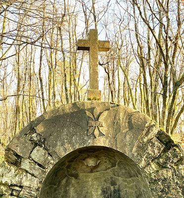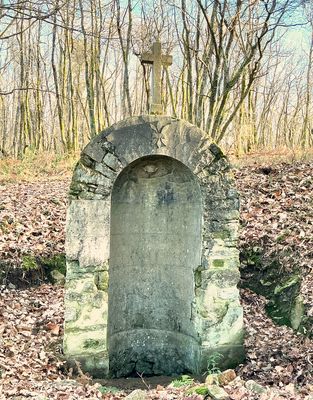 La croix de la fontaine Saint-Martin est en béton. Elle est érigée au point sommital de l’édifice. Une sculpture représente, sur la tranche supérieure, une double fleur de lys accompagnée de la date 1902. À l’intérieur de la fontaine, la tête d’un angelot est sculptée dans la voûte. Située en pleine forêt, cette fontaine constitue un ancien lieu de dévotion probablement antique, christianisé par la suite et placé sous le patronage de saint Martin, réputé pour ses vertus protectrices et thérapeutiques. Comme de nombreuses fontaines similaires, elle fit l’objet d’un culte particulièrement vivace. Il y a encore une soixantaine d’années, on y conduisait les enfants chétifs afin de leur faire suivre une cure jugée bénéfique et reconstituante, ces pratiques ont définitivement cessé dans les années 1950. Le site peut ainsi être interprété comme un espace cultuel, héritier d’une dévotion plus ancienne liée à la source elle-même. La fontaine a perdu sa source lorsque, lors de travaux d’adduction d’eau au bourg, le cours de celle-ci a été détourné de manière irrémédiable.