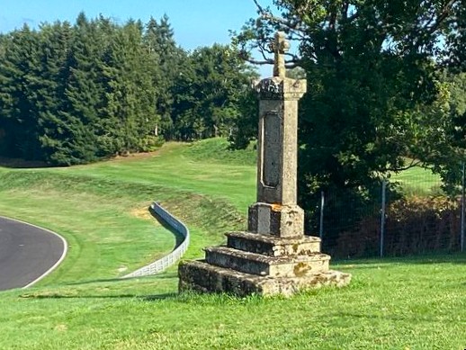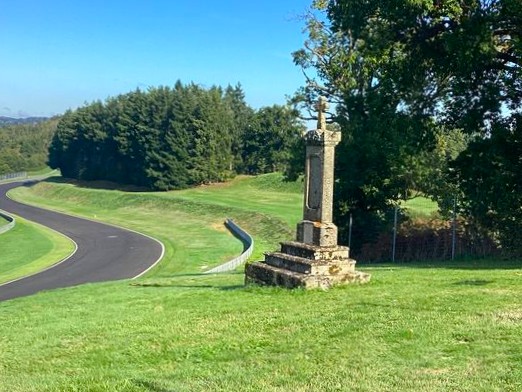Cette croix en granit est située au centre du parcours du circuit du Mas du Clos. Selon la tradition orale, elle aurait été déplacée à cet emplacement à l’initiative de Pierre Bardinon, propriétaire du Mas du Clos, et proviendrait du château des Chiers de Barmont. Elle se compose de plusieurs éléments architecturaux bien distincts. La croix, relativement sobre, présente des bras courts et épais. L’absence de décor sculpté suggère qu’il s’agit d’une croix de type non figuratif. Au sommet du fût, un élément débordant mouluré, faisant office de chapiteau ou de corniche, marque la transition avec la croix proprement dite. Le fût monolithique, de section rectangulaire, est élancé et présente sur l’une de ses faces une niche rectangulaire verticalement allongée, aujourd’hui vide. Cette niche pouvait à l’origine accueillir un élément dévotionnel, ce qui suggère une fonction religieuse affirmée, possiblement liée à une dévotion privée ou seigneuriale. L’ensemble repose sur un socle parallélépipédique, lui-même posé sur un emmarchement de trois degrés. Par ses caractéristiques formelles et son implantation supposée d’origine, cette croix peut être rapprochée des croix monumentales des XVIIᵉ ou XVIIIᵉ siècles, fréquemment érigées dans un contexte seigneurial ou en lien avec un domaine noble.