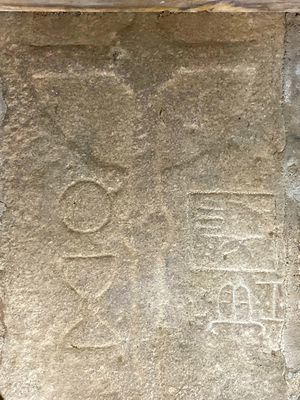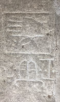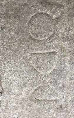 Cette croix inscrite dans un cercle souligne la dimension chrétienne du monument, symbole d’espérance en la résurrection et rappel de la foi du défunt. Cette pierre tombale en granit présente une iconographie riche et symbolique. Au centre, une croix gravée occupe la partie principale de la stèle. Simple et sans décor particulier, elle incarne le symbole chrétien de la mort et de la résurrection. À gauche figure un calice surmonté d’une hostie, tandis qu’à droite une main ouverte semble bénir ou accueillir, probablement en référence à la main de Dieu ou à l’âme du défunt. Cette main évoque la bénédiction divine et la réception de l’âme dans l’au-delà. Sous la main, une série de petits points disposés en colonnes encadre une inscription rudimentaire. Ces points servent de décor ou de séparateurs, fréquents sur les pierres funéraires rurales où la gravure restait sommaire. Enfin, une forme évoquant la lettre M, suivie d’un trait vertical pouvant être interprété comme un I, compose l’ensemble « MI », qui pourrait correspondre à des initiales ou à une abréviation latine. Cette pierre tombale s’inscrit dans la tradition funéraire rurale des XVIIᵉ – XVIIIᵉ siècles, où la sobriété des moyens s’accompagnait souvent d’une forte charge symbolique.