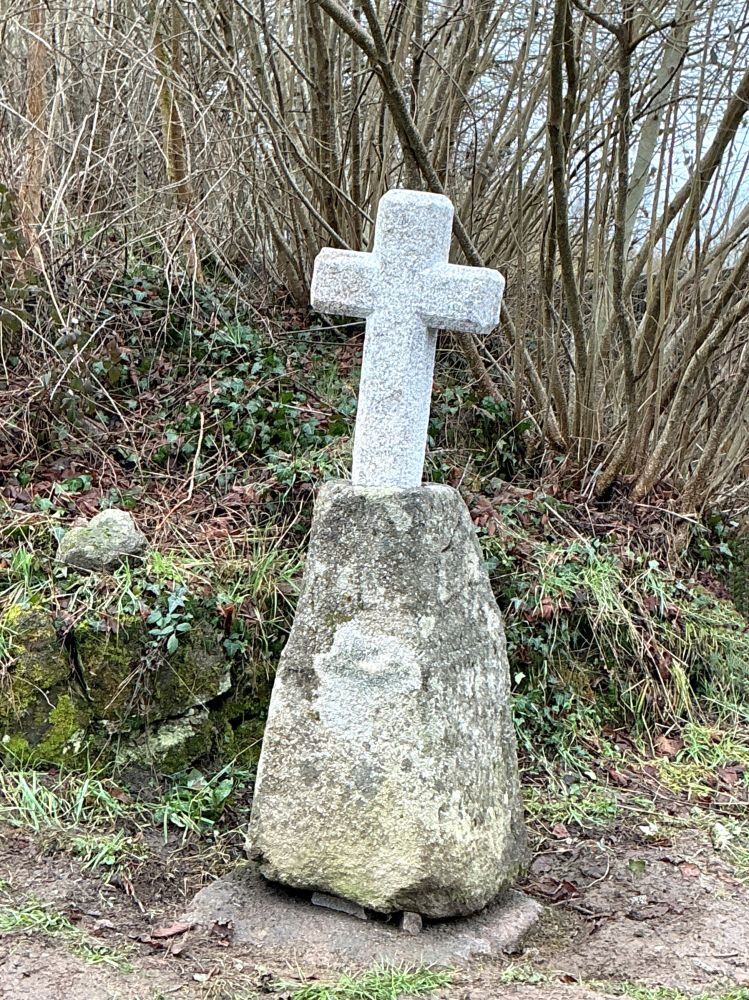 Cette croix en granit n’existe plus qu’à l’état fragmentaire en 2025 : seul son socle monolithe est resté intact. Sur l’une de ses faces, une croix en relief est sculptée, avec à sa base une fleur de lys. Sur une autre face, on distingue deux petites croix grecques gravées en creux. Disparue un temps sous la végétation, elle a été dégagée par Nicole Fournaison, puis restaurée par des habitants du hameau. La présence de la fleur de lys à la base de la croix pourrait avoir plusieurs significations. Symbole marial par excellence, elle évoque la pureté et la Vierge Marie, à laquelle de nombreuses croix rurales sont dédiées. Mais elle peut également rappeler le pouvoir royal, la fleur de lys étant l’emblème de la monarchie française. Dans ce contexte, elle pourrait témoigner d’un attachement au roi ou à la foi catholique, notamment après les troubles religieux ou politiques des siècles passés.