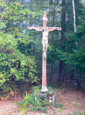 Cette croix de mission monumentale en bois, aux extrémités pommelées, porte au sommet, inscrit dans un phylactère, le monogramme INRI. Au centre du croisillon se dresse un Christ en croix de grande taille, la tête penchée à droite, le périzonium noué sur l’avant, les pieds posés sur un petit dais. La croix est fixée dans un socle en béton. Son appellation provient de sa situation, à l’entrée du bois du Breux.