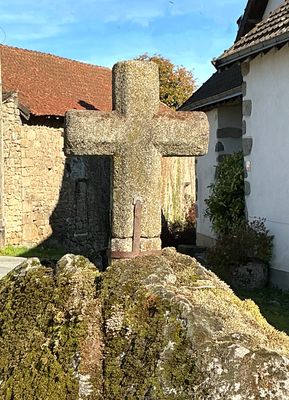 Croix latine simple en granit, présentant des arêtes chanfreinées. Le fût, aujourd’hui restauré, avait été brisé et a fait l’objet d’une consolidation par des agrafes en fer forgé, scellées au plomb. L’ensemble est solidement implanté au sommet d’un imposant rocher, situé au départ d’un chemin creux conduisant au lavoir du hameau.