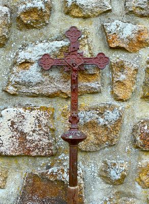Cette croix de procession est constituée d’une croix latine métallique fixée au sommet d’une hampe en bois. Les bras se terminent par des extrémités trilobées, ornées de motifs végétaux stylisés en relief, caractéristiques du décor néogothique du XIXᵉ siècle. Au centre de la croix figure un Christ crucifié en relief. La tête est inclinée, le corps allongé et le périzonium noué à la taille. Au sommet du montant vertical se trouve le titulus portant l’inscription INRI, rappelant la mention placée sur la croix du Christ lors de la Crucifixion. Le montant vertical de la croix est décoré de rinceaux de lierre en relief. Sous la croix se trouve un nœud balustre, richement orné de motifs floraux. Cet élément, placé entre la croix et la hampe, permettait une meilleure prise en main et marquait le centre de l’objet lors des processions.