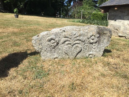 Ce linteau est magnifiquement sculpté. Au centre, un large cœur stylisé, symbole traditionnel d’amour, de dévotion ou de protection, particulièrement fréquent sur les linteaux et pierres gravées anciennes. Au-dessus du cœur, trois arcs ou vagues qui peuvent évoquer soit des rayons solaires stylisés, soit des motifs végétaux ou abstraits à caractère décoratif. Sur les côtés et à la base du cœur, des motifs circulaires ou en spirale, pouvant représenter le cycle de la vie ou servir de simples ornements. L’ensemble constitue une composition typique que l’on retrouve sur certains linteaux de portes anciennes dans la Creuse, mêlant symbolisme protecteur ou affectif et éléments décoratifs abstraits. Il est probable que ce linteau ait été conçu pour marquer la pierre d’un signe de protection et d’amour, renforçant le caractère symbolique du bâtiment auquel il appartenait.