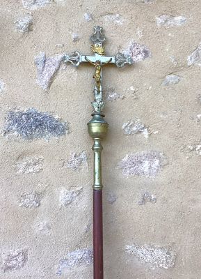 Cette croix de procession fleurdelisée est en métal. Au centre du croisillon se trouve un Christ en croix, les bras relevés, et au-dessus de sa tête un ange porte le titulus INRI. Sur le fût figurent également deux anges ailés. Le pommeau est simple et la hampe en bois. On se rendait en procession à la croix de Châtenet-le-Vieux le 29 septembre, en portant la statue de saint Silvain ornée de ses rubans. La statue conservée dans l’église est datée du XVIIᵉ siècle. À Saint-Silvain-sous-Toulx, il existe une tradition très ancienne autour de la statue de saint Silvain, dite « habillée de rubans ». On y attachait des rubans de soie ou de tissu coloré, bénis, qui avaient une valeur à la fois protectrice et votive. Ces rubans étaient parfois décousus ou découpés en morceaux, puis conservés dans les maisons ou les étables afin d’éloigner la maladie, l’orage ou les accidents.