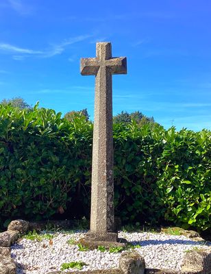 Cette haute croix latine contemporaine en granit, aux arêtes chanfreinées, ne présente ni figuration ni millésime. Elle est érigée sur un amas rocheux, au départ de l’ancien chemin qui passe par le moulin, puis devant la croix de l’ancien pont de Gouby pour rejoindre le hameau.