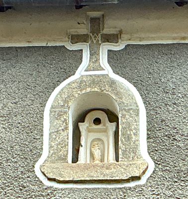 Cette croix est sculptée en léger relief. Elle présente des bras courts et élargis à leurs extrémités. Au centre, on distingue un monogramme marial formé d’un M entrelacé, ce qui renforce l’idée d’une protection placée sous le patronage de la Vierge. La croix est intégrée à la maçonnerie, comme partie constitutive de la composition. un petit édicule sculpté miniature, doté d’une petite ouverture circulaire à son sommet. Dans la niche intérieure se trouve une petite statue, en bas-relief, représentant une Vierge à l’Enfant. Ce type d’aménagement correspond à une niche de dévotion domestique, fréquente dans les campagnes. Elle remplissait plusieurs fonctions : protection spirituelle de la maison et de ses habitants, affirmation publique de la foi catholique, et marque apotropaïque destinée à éloigner le mal, les maladies et les intempéries.