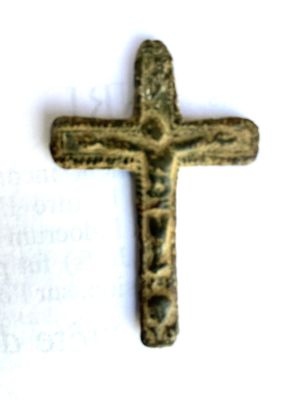 Avers : Représentation du Christ crucifié, les bras étendus, la tête penchée, avec l’inscription INRI au-dessus de la tête. Sous les pieds du Christ figure un objet stylisé, non identifiable.