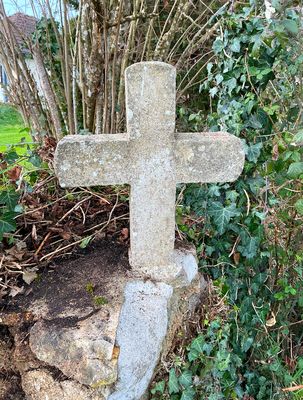 Cette petite croix en béton se caractérise par des extrémités aux formes arrondies. Elle est simplement posée au sommet d’un mur de clôture en pierres sèches. Dépourvue de toute figuration sculptée ou gravée, elle ne présente également aucun millésime ni inscription permettant d’en préciser la date d’érection. Par sa sobriété et l’emploi de matériaux modestes, elle s’inscrit dans la tradition des croix rurales à vocation essentiellement dévotionnelle ou de marquage symbolique de l’espace.