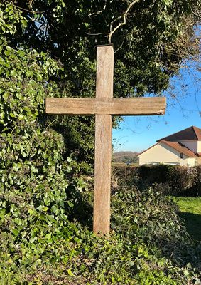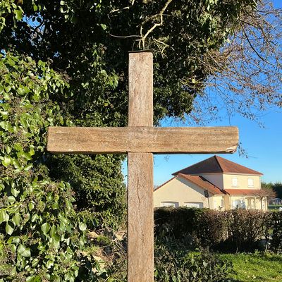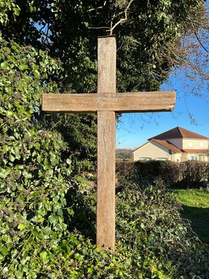 Cette croix simple est en bois, ces arêtes sont arrondies. Elle est érigée au centre du hameau au sommet d’un mur en pierres sèches. Elle est située au carrefour d’un chemin creux qui arrive du hameau de l’Age du curé, prend la direction du chemin du paradis, puis du hameau de Peuroche.