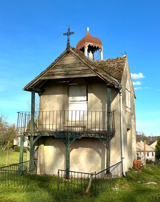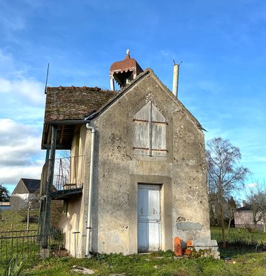 Cette croix sommitale en fonte ajourée est typique des chapelles rurales et des édifices de dévotion locale. Ses bras horizontaux et verticaux se terminent par des extrémités trilobées, motif décoratif évoquant symboliquement la Trinité. Le noyau central ajouré, est composé de volutes et d’entrelacs moulés. Le fût inférieur, également ornementé, intègre un motif ajouré vertical assurant la transition entre la croix proprement dite et son système de fixation. La perception inhabituelle de la croix, observée ici par l’arrière, est liée à l’orientation du bâtiment par rapport au point d’observation. La croix est installée dans le sens liturgique correct, seule sa face non décorée principale étant visible depuis ce point de vue. Son implantation sur le pignon, et non sur un clocher, confirme le caractère modeste de l’édifice. Le petit dôme abritant la statue de la Vierge est surmonté d’un ornement sommital de forme élancée. Ce motif, évoquant une flamme stylisée ou un bouton floral fermé. Sur le plan symbolique, cette forme peut être interprétée comme une représentation de la flamme spirituelle. Elle peut également être rapprochée du registre marial du lys, symbole traditionnel de pureté et de l’Immaculée Conception, fréquemment associé à la Vierge dans l’iconographie chrétienne. Ce type d’ornement est caractéristique des édicules religieux et des petites chapelles rurales édifiées ou remaniées à la fin du XIXe siècle et au début du XXe siècle, période marquée par un renouveau des pratiques dévotionnelles et par l’essor des chapelles de pèlerinage et de dévotion locale. La présence de la Vierge sous le petit clocheton constitue l’élément symbolique le plus significatif. La statue est placée dans une niche ouverte, surmontée d’un clocheton-campanile de faible dimension. Il s’agit clairement d’un édifice dédié à la Vierge, ce qui confirme pleinement son appellation. La figure mariale apparaît ici comme protectrice du lieu, visible depuis l’extérieur, associée à une fonction votive et probablement funéraire. Le petit clocheton à toiture conique, parfois qualifiée de bulbe simple, correspond à une typologie fréquemment rencontrée aux XVIIe et XVIIIe siècles. Il accueillait très vraisemblablement une cloche de chapelle, utilisée lors des prières, des enterrements ou à l’occasion d’usages ponctuels tels que les processions et les dévotions locales. L’architecture générale repose sur une maçonnerie traditionnelle en pierre locale enduite, associée à une couverture en tuiles plates. L’édifice ne relève pas d’une construction néogothique « neuve » du XIXe siècle, mais correspond plutôt à un bâtiment plus ancien ayant fait l’objet d’adaptations et de reprises successives. La datation la plus probable peut ainsi être proposée : construction initiale au XVIIe siècle (voire à la fin du XVIe siècle), avec des remaniements aux XVIIIe et XIXe siècles. Cette hypothèse repose sur plusieurs arguments concordants : typologie mariale rurale, présence d’un clocheton modeste, installation d’une croix sommitale en fonte industrielle et existence attestée de sépultures. L’association chapelle et inhumations présente en effet une forte cohérence historique. La chapelle a servie de lieu de sépulture privilégié pour certaines familles ou à un usage antérieur à la normalisation stricte des cimetières paroissiaux. Ce schéma est caractéristique de nombreuses petites chapelles funéraires ou semi-funéraires du Limousin.