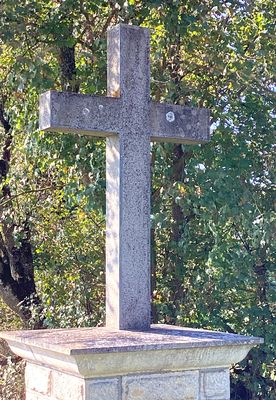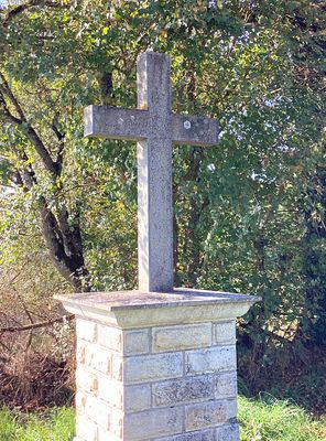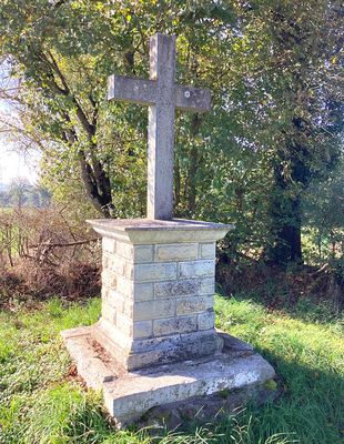 Implantée sur une base dallée de granit, cette croix latine de grande taille, réalisée en béton, est une œuvre contemporaine. Elle s’élève sur un piédestal en pierre calcaire appareillée. La croix est insérée dans une double table en granit, fixée par deux agrafes en fer forgé. Les tables présentent un profil mouluré d’une doucine gimpée, témoignant d’un soin particulier apporté à la finition. L’ensemble associe différents matériaux (granit et calcaire) à une structure moderne en béton, traduisant la continuité de la tradition des croix de chemin.