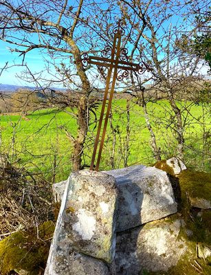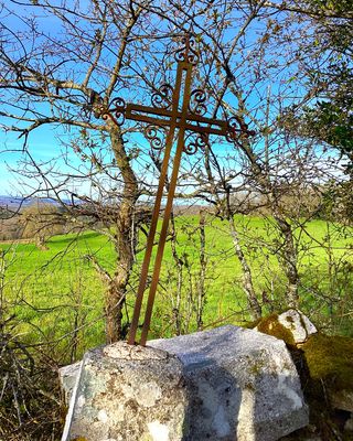 Cette croix est en fer forgé ajouré. Ses extrémités sont en forme de cœur et ornées d’une fleur de pavot. Le centre de la croix est décoré de quatre volutes. Son fût pyramidal en granit présente des arêtes légèrement arrondies. La croix a été renversée de son piédestal, constitué de deux dalles plates. Le pavot, connu depuis l’Antiquité pour ses propriétés somnifères, est ici associé au sommeil éternel.