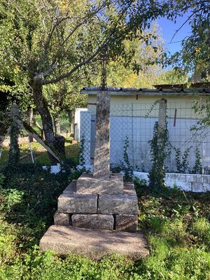 Cette croix fleurdelisée en fonte présente au centre du croisillon un crucifix portant le Christ en croix, la tête ceinte d’une couronne d’épines. Sur le croisillon supérieur, un cartouche (timbre) arbore le monogramme INRI, entouré de quatre rayons lumineux. Le reste de la croix est orné de motifs végétaux, feuilles de vigne et épis de typhas, symboles respectifs de l’Eucharistie et de l’abondance. L’ensemble est érigé sur un fût pyramidal en granit, lui-même inséré dans un socle carré. Le piédestal, en maçonnerie traditionnelle, comporte à sa base un reposoir destiné aux dévotions locales. Le typhas, aussi appelé « massette » ou « quenouille des marais », est une plante aquatique des zones humides. Sa présence dans la décoration des croix en fonte du XIXᵉ siècle n’est pas anodine. le typhas renvoie davantage au registre de la fertilité, de la vie naturelle et de l’abondance des moissons.