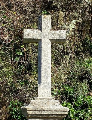 Cette croix latine chanfreinée est de facture contemporaine. Elle est implantée dans une table moulurée composée de feuillures et d’une gorge, qui lui sert de base immédiate. L’ensemble repose sur un piédestal monolithe en pierre de taille, lui-même établi sur un emmarchement de trois degrés. Cette composition soignée, typique des aménagements religieux modernes inspirés des modèles anciens, et confère à la croix une présence traditionnels des croix de chemin ou de cimetière.