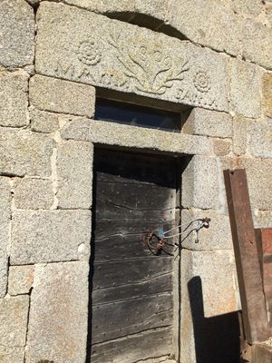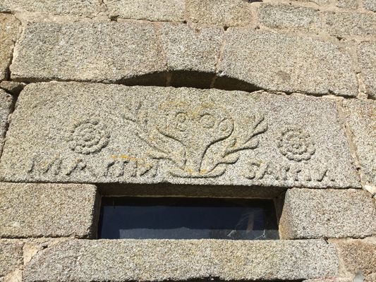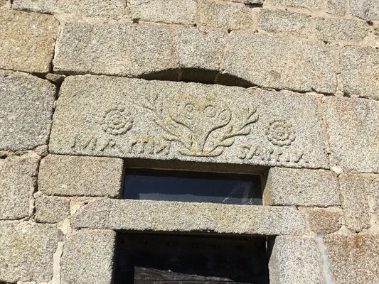 Ce linteau monolithe en granit local est taillé en léger arc plat et surmonte une imposte rectangulaire. La face visible présente une décoration symétrique organisée autour d’un motif végétal stylisé composé de deux rameaux affrontés de laurier, dont les tiges se rejoignent en un cœur central. Au centre de ce cœur, la présence de la date 1806 permet de situer avec précision l’exécution de la gravure. À chaque extrémité du linteau figure une rosace ou fleur à pétales gravée en faible relief. Entre ces motifs, une inscription en capitales occupe toute la longueur de la pierre : MARTIN SAPPIN Le N du prénom MARTIN et le nom de SAPPIN sont gravés à l’envers, détail parfois rencontré dans la gravure populaire. L’ensemble constitue très vraisemblablement la signature du tailleur de pierre ou du maçon ayant réalisé le linteau. La pratique de signer une pierre d’œuvre est attestée dans la région creusoise entre la fin du XVIIIᵉ et le début du XIXᵉ siècle, notamment chez des artisans fiers de leur savoir-faire.