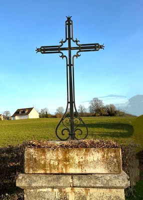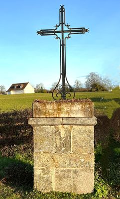 Cette croix est de forme latine, entièrement réalisée en fer forgé. Elle est constituée de deux montants parallèles formant le fût et les bras, reliés par des entretoises horizontales. Les extrémités des bras et du sommet sont ornées de fleurons stylisés, aux formes recourbées évoquant des bourgeons ou des flammes, motif fréquent dans la serrurerie religieuse du XIXᵉ siècle. À la croisée, des volutes symétriques adoucissent la transition entre le fût et les bras. La partie inférieure du fût se termine par un élargissement ornemental, composé de volutes affrontées, servant à la fois d’élément décoratif et de renfort structurel avant l’ancrage dans la pierre. Elle repose sur une table en pierre de taille, aux arêtes chanfreinées. Le piédestal en pierre appareillée présente une face centrale portant la date gravée « 1900 », indiquant très probablement l’année d’érection ou de réinstallation du monument.