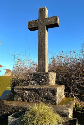 Cette haute et large croix de mission, réalisée en béton, est datée de 1920. Elle présente une silhouette monumentale et élancée, caractéristique des croix de mission érigées au début du XXe siècle. L’avers est orné de motifs circulaires en léger relief, disposés de manière régulière, qui animent la surface tout en conservant une grande sobriété décorative. La croix repose sur un socle de plan carré, également en béton, assurant la stabilité de l’ensemble. Celui-ci est lui-même implanté sur un emmarchement composé de trois degrés, qui élève le monument et renforce sa visibilité.