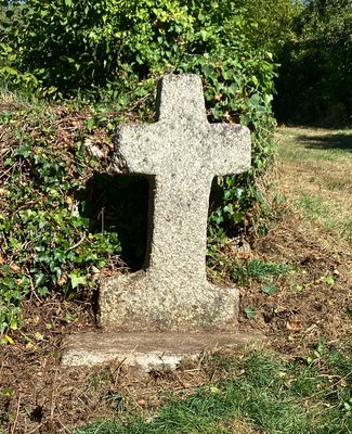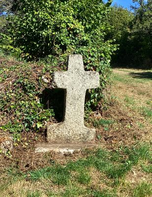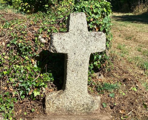 Cette croix latine, façonnée d’un seul bloc de granit avec son socle intégré, se distingue par sa sobriété, elle ne porte ni ornementation, ni millésime. Son emplacement, à l’entrée d’un chemin creux proche du pigeonnier, lui conférait une fonction à la fois pratique et symbolique. Cette croix s’inscrit dans la tradition des croix de chemin, qui servaient de repères topographiques et spirituels. Elle guidait autrefois les habitants et pèlerins vers l’église. Par sa simplicité, elle témoigne de la piété populaire et de l’importance de ces modestes monuments.