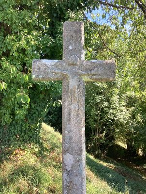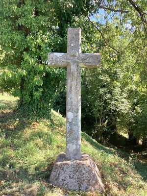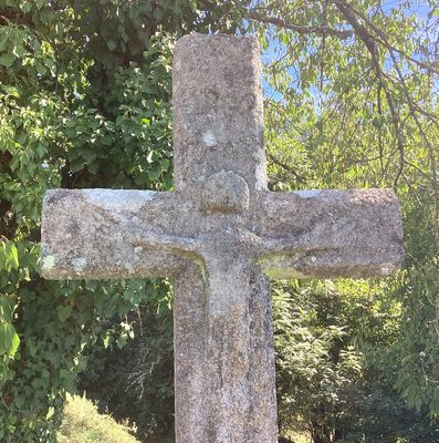 Cette haute croix latine en granit présente des arêtes chanfreinées. Au centre du croisillon se distingue un Christ en croix, taillé de manière sommaire, caractérisé par une grosse tête, des mains larges et des jambes fines. Le fût, légèrement tronconique, est inséré dans un socle en pyramide tronquée. Aucun millésime n’est visible sur l’ensemble.