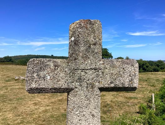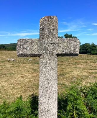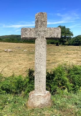 Cette croix latine en granit, de section octogonale, est sculptée d’un Christ en croix en bas-relief, dont les traits sont aujourd’hui très altérés par l’érosion. L’ensemble est inséré dans un socle de forme cylindrique, reposant lui-même sur une dalle de pierre. Par son iconographie, il s’agit d’un monument de dévotion, destiné à rappeler la Passion du Christ et à inviter à la prière. Ce type de croix pouvait signaler un lieu de passage ou encore servir de repère spirituel au sein de la communauté. L’usure de la sculpture témoigne de son ancienneté.