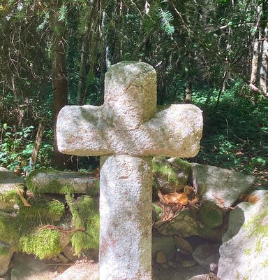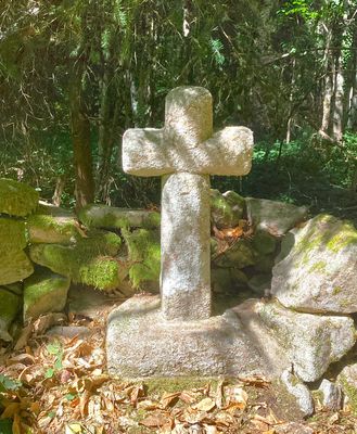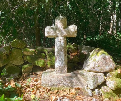 Cette petite croix en granit, de section octogonale, a été cassée puis restaurée. Le patibulum repose directement sur le fût, lui-même scellé dans un socle enchâssé dans un amas de pierres. L’ensemble est entouré d’un petit muret en pierre sèche qui délimite son emplacement. Elle est connue sous le nom de « croix du chemin des Chèvres », appellation héritée du sentier qui y conduit, aujourd’hui encombré de grosses pierres.