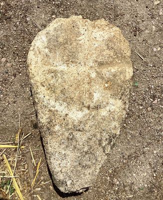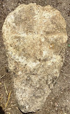 Cette pierre en granit, était insérée dans le mur de l’ancien cimetière médiéval de Toulx-Sainte-Croix, elle porte la gravure d’une croix en creux. Bien que l’érosion ait fortement atténué les contours, on distingue une croix aux bras évasés, de type patté, se rapprochant du répertoire des croix entre les XIᵉ et XIIIᵉ siècles. Il pourrait s’agir d’un fragment de stèle ou de pierre tombale réemployé lors de la construction du mur. La croix, par sa forme trapue et ses bras élargis, témoigne d’une tradition funéraire médiévale locale, où ces symboles servaient à marquer les sépultures et à affirmer la dimension chrétienne des espaces d’inhumation.