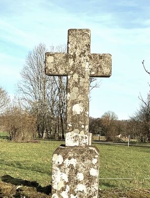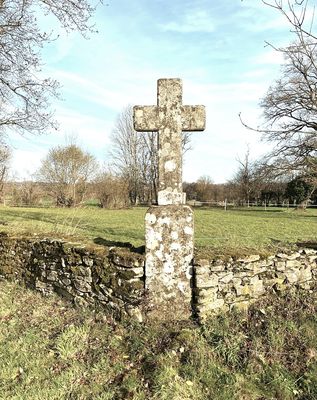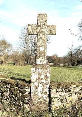 Cette croix en granit, de grandes dimensions, présente une forme simple, sans figuration ni inscription datée. Elle est insérée dans un haut socle monolithe dont le sommet est arrondi. L’ensemble est intégré dans l’angle d’un mur en pierre sèche.