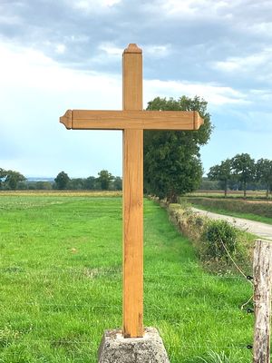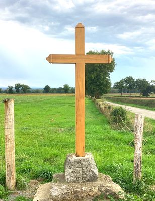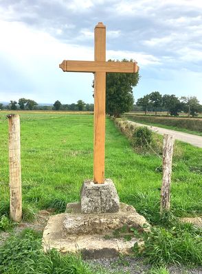 Cette croix pommetée en bois, dépourvue de figuration, est insérée dans un socle tronconique en granit, recroiseté. La base est réalisée en maçonnerie traditionnelle. Elle a été conçue vers 1994 par Franck Vialle, menuisier à Évaux-les-Bains, à la demande de Colette et Daniel Chaussemy, propriétaires du lieu-dit Sac. Le nom de la croix est directement lié aux terrains qui l’entourent. À la suite de travaux importants d’élargissement de la route menant à Budelière, cette croix a été refaite en 2025, conservant ainsi sa place dans le paysage local.