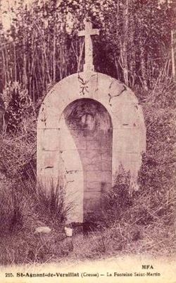 La croix de la fontaine Saint-Martin est en béton. Elle est érigée au point sommital de l’édifice. Une sculpture représente, sur la tranche supérieure, une double fleur de lys accompagnée de la date 1902. À l’intérieur de la fontaine, la tête d’un angelot est sculptée dans la voûte. Située en pleine forêt, cette fontaine constitue un ancien lieu de dévotion probablement antique, christianisé par la suite et placé sous le patronage de saint Martin, réputé pour ses vertus protectrices et thérapeutiques. Comme de nombreuses fontaines similaires, elle fit l’objet d’un culte particulièrement vivace. Il y a encore une soixantaine d’années, on y conduisait les enfants chétifs afin de leur faire suivre une cure jugée bénéfique et reconstituante, ces pratiques ont définitivement cessé dans les années 1950. Le site peut ainsi être interprété comme un espace cultuel, héritier d’une dévotion plus ancienne liée à la source elle-même. La fontaine a perdu sa source lorsque, lors de travaux d’adduction d’eau au bourg, le cours de celle-ci a été détourné de manière irrémédiable.