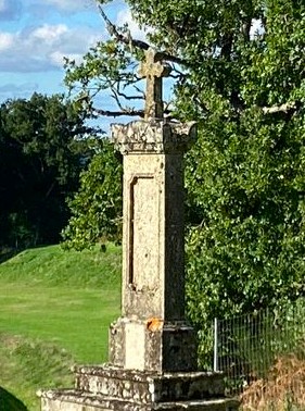 Cette croix en granit est située au centre du parcours du circuit du Mas du Clos. Selon la tradition orale, elle aurait été déplacée à cet emplacement à l’initiative de Pierre Bardinon, propriétaire du Mas du Clos, et proviendrait du château des Chiers de Barmont. Elle se compose de plusieurs éléments architecturaux bien distincts. La croix, relativement sobre, présente des bras courts et épais. L’absence de décor sculpté suggère qu’il s’agit d’une croix de type non figuratif. Au sommet du fût, un élément débordant mouluré, faisant office de chapiteau ou de corniche, marque la transition avec la croix proprement dite. Le fût monolithique, de section rectangulaire, est élancé et présente sur l’une de ses faces une niche rectangulaire verticalement allongée, aujourd’hui vide. Cette niche pouvait à l’origine accueillir un élément dévotionnel, ce qui suggère une fonction religieuse affirmée, possiblement liée à une dévotion privée ou seigneuriale. L’ensemble repose sur un socle parallélépipédique, lui-même posé sur un emmarchement de trois degrés. Par ses caractéristiques formelles et son implantation supposée d’origine, cette croix peut être rapprochée des croix monumentales des XVIIᵉ ou XVIIIᵉ siècles, fréquemment érigées dans un contexte seigneurial ou en lien avec un domaine noble.
