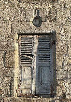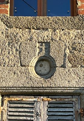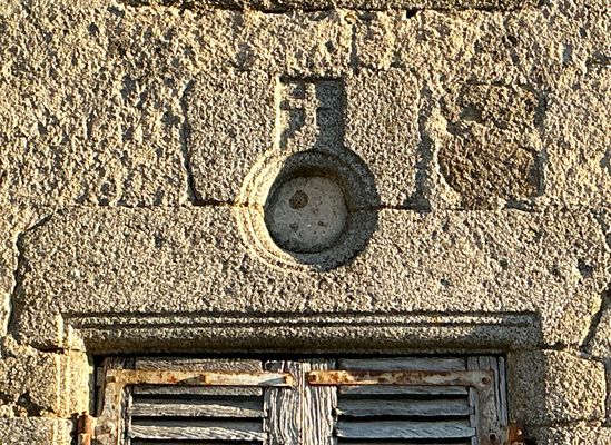 Ce linteau monolithe en granit, soigneusement taillé, surmonte une fenêtre d’habitation. Il présente un décor sculpté en faible relief, à la fois sobre et symbolique. Dans la partie supérieure, un cartouche rectangulaire abrite une croix latine incisée aux bras courts et égaux, symbole de la foi chrétienne et marque traditionnelle de protection. Sous cette croix, une arcature semi-circulaire encadre un médaillon circulaire creusé, aujourd’hui vide. Ce cercle central semble avoir été conçu pour recevoir un élément rapporté : petite croix métallique, médaille, bénitier domestique ou symbole religieux peint. L’ensemble est délimité par une moulure rectiligne suivant le contour du linteau. Ce décor associe la rigueur géométrique du travail du tailleur de pierre à une symbolique religieuse affirmée. La sobriété des formes, la qualité de la taille et la composition équilibrée permettent de situer cette réalisation entre la fin du XVIIᵉ et le XVIIIᵉ siècle, période où les symboles religieux domestiques sont courants.
