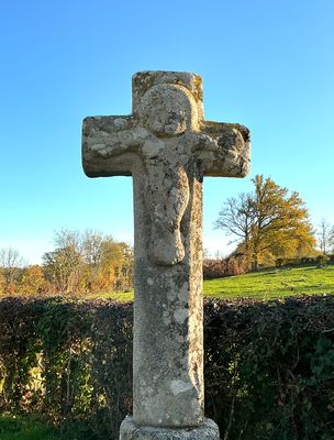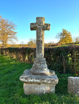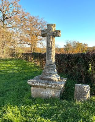 Cette épaisse croix latine en granit présente, au centre du croisillon, un Christ rustique grossièrement sculpté. Le socle, de forme tronconique arrondie, est finement mouluré et repose sur une double table en pierre. L’ensemble est soutenu par un piédestal en pierre de taille. La croix se situe à l’entrée d’un petit château féodal, comprenant deux tours principales, dont un donjon, ainsi qu’une échauguette. L’ensemble est relié par un mur d’enceinte où subsistent des traces de mâchicoulis médiévaux. Le château du Cros est mentionné dès la fin du XVe siècle. Le 8 décembre 1487, un cartulaire cite Simon Fricon, écuyer et seigneur du fief du Cros. La seigneurie passa ensuite aux familles Tacquenet (ou Taquenet), puis aux familles Fayolle.