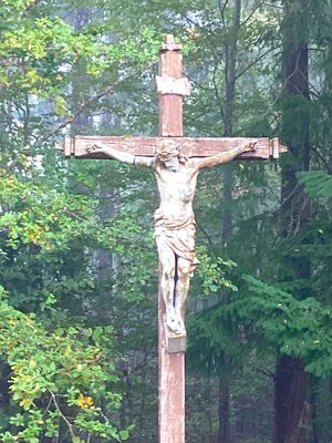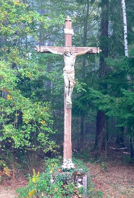 Cette croix de mission monumentale en bois, aux extrémités pommelées, porte au sommet, inscrit dans un phylactère, le monogramme INRI. Au centre du croisillon se dresse un Christ en croix de grande taille, la tête penchée à droite, le périzonium noué sur l’avant, les pieds posés sur un petit dais. La croix est fixée dans un socle en béton. Son appellation provient de sa situation, à l’entrée du bois du Breux.