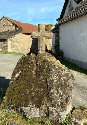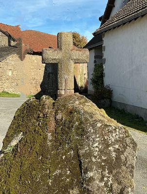 Croix latine simple en granit, présentant des arêtes chanfreinées. Le fût, aujourd’hui restauré, avait été brisé et a fait l’objet d’une consolidation par des agrafes en fer forgé, scellées au plomb. L’ensemble est solidement implanté au sommet d’un imposant rocher, situé au départ d’un chemin creux conduisant au lavoir du hameau.