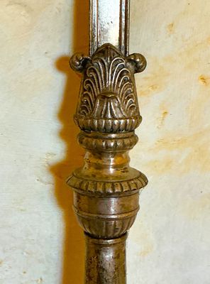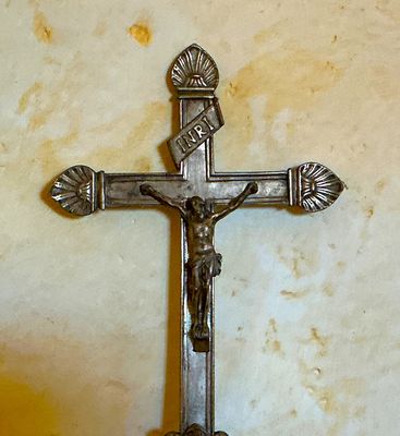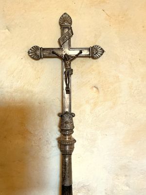 Cette croix de procession est en métal argenté, montée sur une hampe en bois tourné. Les extrémités des bras sont ornées d’un motif rayonnant en éventail, assimilable à une palmette stylisée, symbole de la gloire divine. Au centre est fixé un Christ en croix de facture sobre. Le corps, élancé, est représenté la tête inclinée sur l’épaule, vêtu d’un périzonium noué sur le côté. Le sommet du montant vertical est surmonté d’un titulus « INRI », disposé en biais, élément décoratif caractéristique de ce type d’objet. La croix repose sur un pommeau particulièrement travaillé, décoré de palmettes rayonnantes, de moulures et de petites volutes latérales. Ce nœud assure la transition entre la croix métallique et la hampe en bois. Cet objet peut être daté de la seconde moitié du XIXᵉ siècle. Une procession avait lieu à l’occasion de la Saint-Jean, elle effectuait le tour de la croix de la place de l’Arbre. Les processions et rogations empruntaient l’itinéraire suivant : le premier jour, la croix de Tayolet, le deuxième jour, la croix Marc, le troisième jour, la croix du Verger. Un arrêté municipal en date du 24 mai 1904 interdit toutefois les processions et l’exercice de tout culte en dehors de l’église.