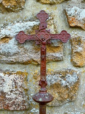 Cette croix de procession est constituée d’une croix latine métallique fixée au sommet d’une hampe en bois. Les bras se terminent par des extrémités trilobées, ornées de motifs végétaux stylisés en relief, caractéristiques du décor néogothique du XIXᵉ siècle. Au centre de la croix figure un Christ crucifié en relief. La tête est inclinée, le corps allongé et le périzonium noué à la taille. Au sommet du montant vertical se trouve le titulus portant l’inscription INRI, rappelant la mention placée sur la croix du Christ lors de la Crucifixion. Le montant vertical de la croix est décoré de rinceaux de lierre en relief. Sous la croix se trouve un nœud balustre, richement orné de motifs floraux. Cet élément, placé entre la croix et la hampe, permettait une meilleure prise en main et marquait le centre de l’objet lors des processions.