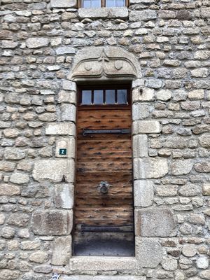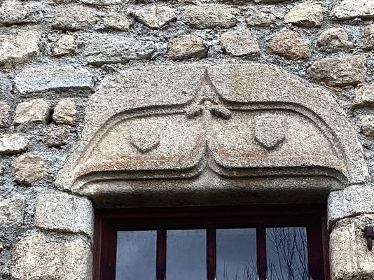 Ce linteau en accolade sculpté en granit, surmonte une baie rectangulaire. La forme en accolade présente un fleuron central et deux écus en réserve, un de chaque côté de l’arc, ceux-ci sont restés vierges ou ont été usés/effacés.