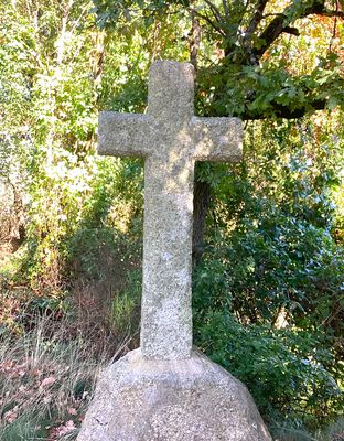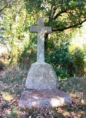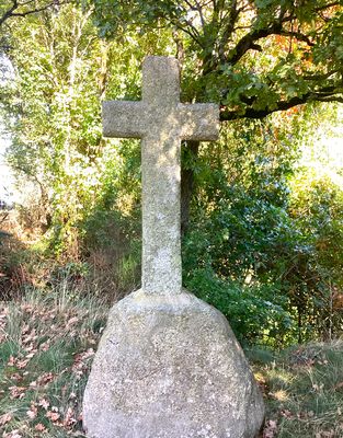 Cette croix latine, en granit, ne porte ni figuration ni millésime. Son fût est reçu dans une large mortaise creusée au sommet d’un socle en pyramide tronquée. À la base du monument se trouve une table des morts, destinée aux cérémonies funéraires ou commémoratives. La croix est implantée dans un chemin, en surplomb d’une ancienne carrière de granit, rappelant ainsi le lien entre le matériau et le paysage environnant. Le site reste associé à la dévotion locale : chaque 28 septembre, il est le lieu de la procession en l’honneur de saint Silvain.